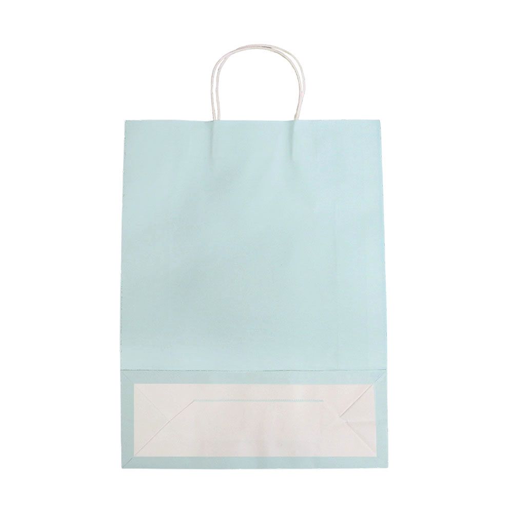 Подарочный пакет из крафтовой бумаги пастельного оттенка с белыми бумажными ручками и белой внутренней стороной.