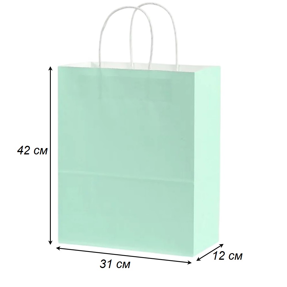 Подарочный пакет из крафтовой бумаги пастельного тона с белыми бумажными ручками, внутренняя сторона белая.