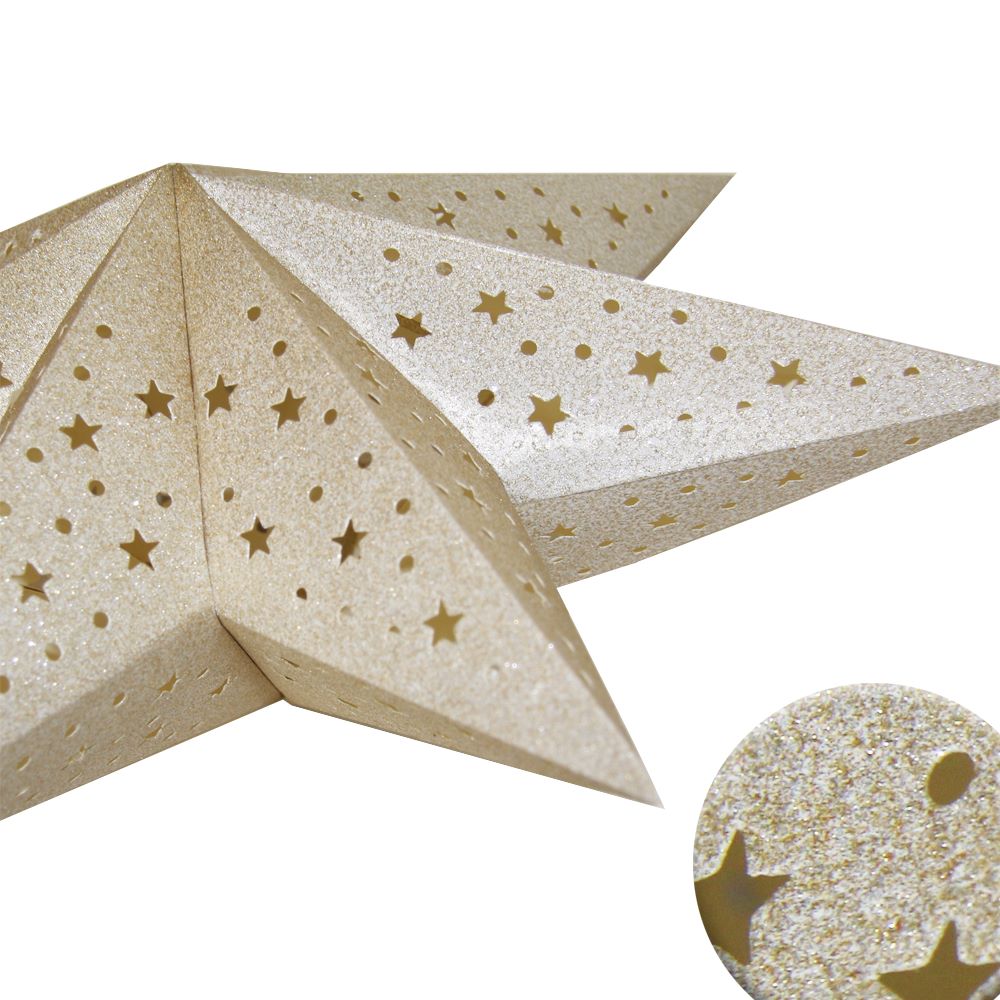 Семиконечная объемная звезда 45 см — великолепный декор из тонкого перфорированного картона с золотыми блестками. Создает красивые световые эффекты. Поставляется в сложенном виде, в комплекте шнур для фиксации объема и подвеса.