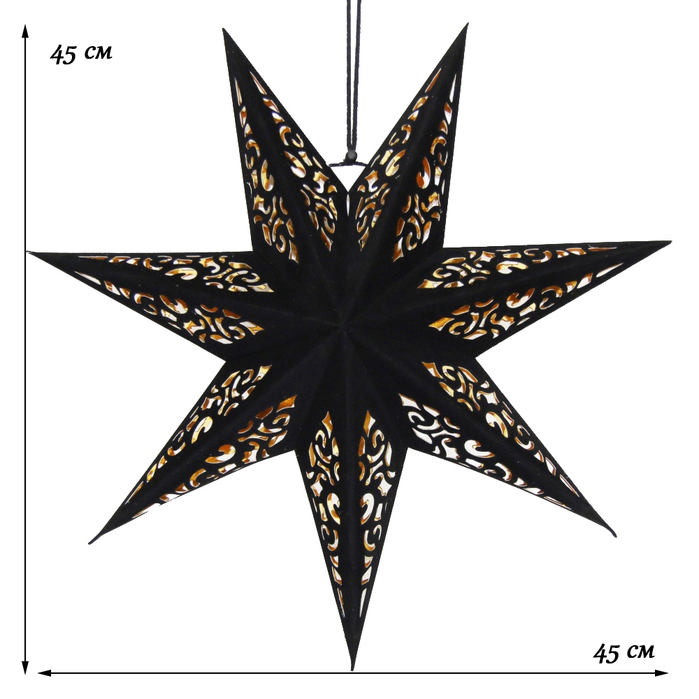 Семиконечная объемная звезда 45 см — великолепный декор из перфорированного бархатного картона. Создает красивые световые эффекты. Поставляется в сложенном виде, в комплекте шнур для фиксации объема и подвеса.